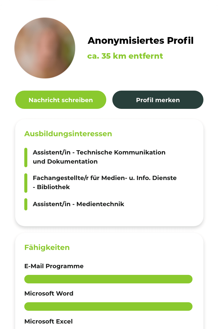 Auszubildende finden muss nicht schwer sein. beAzubi ist der einfachste Weg um mit Ausbildungssuchenden in Kontakt zu treten. beAzubi wurde gemeinsam mit dem Kreis Minden-Lübbecke entwickelt und integriert Schulen, Schüler:innen und Unternehmen in einem System. So erreichen Sie, als Unternehmen, bereits Schüler:innen ab der 8. Klasse und finden Jugendliche aus Ihrer Region für Berufsfelderkundungstage, Praktika und Ausbildungsplätze. Die Berufsfelderkundung startet Anfang 2022 für Schüler:innen im Kreis Minden-Lübbecke. Nehmen Sie als Unternehmen jetzt teil und genießen Sie die Vorteile von beAzubi. Auf unserer Download-Seite finden Sie umfangreiches Informationsmaterial als E-Book oder zum Ausdrucken. Zeigen Sie Jugendlichen und Ausbildungssuchenden, warum Ihr Unternehmen das Richtige für eine Ausbildung oder ein Praktikum ist. Heben Sie sich mit Ihrem Profil von anderen Unternehmen ab! Laden Sie Medien hoch, präsentieren Sie Ihre Vorteile für Mitarbeitende und veröffentlichen Sie interessante Neuigkeiten. Definieren Sie Ihre individuellen Anforderungen und erhalten Sie automatisch passende Profilvorschläge von potenziellen Auszubildenden. Setzen Sie passende Profile auf Ihre Merkliste, so behalten Sie Ihre Favoriten im Blick und können die Unterschiede schnell & einfach vergleichen. Sie haben Ihre Favoriten ausgewählt? Super! Dann starten Sie ein Interview und lernen Ihre potenziellen Auszubildenden näher kennen. Im Anschluss erhalten Sie eine übersichtliche Auswertung der Interviews und haben die Möglichkeit Ihre Auserwählten zu einem persönlichen Gespräch einzuladen. Nachwuchsrekrutierung aus der Region, für die Region.