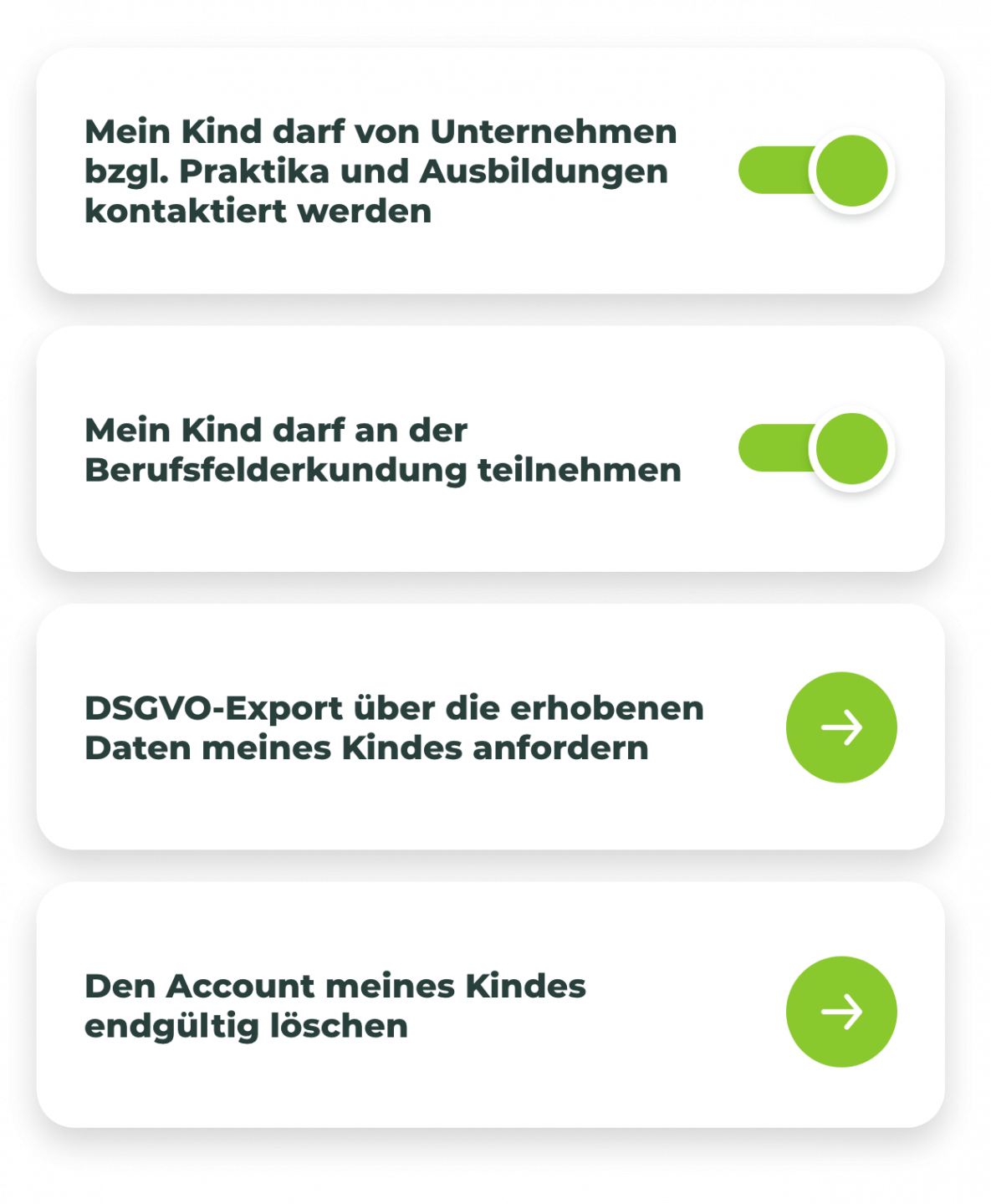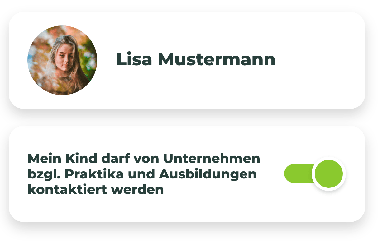 Für Nutzer:innen unter 16-Jahren stellen wir ein Dashboard für Eltern zur Verfügung. Damit können Eltern die Nutzung Ihres Kindes verfolgen und Bereiche freischalten oder einschränken. Ein großer Teil von beAzubi ist die Ausbildungs- oder Praktikumssuche. Je nach Alter Ihres Kindes ist es sinnvoll, dass dieser Teil von beAzubi eingeschränkt wird und erst später aktiviert werden soll. Über das Eltern-Dashboard können Sie genau dies für jedes Ihrer Kinder individuell entscheiden. Ein weiterer Teil von beAzubi ist die Berufsfelderkundung. Diese dient als erste berufliche Erfahrung für Schüler:innen der 8. Klasse. Ob Ihr Kind an einer solchen Berufsfelderkundung teilnehmen darf, obliegt Ihnen als Elternteil. Über das Eltern-Dashboard können Sie für jedes Ihrer Kinder individuell entscheiden, ob sie an der Berufsfelderkundung teilnehmen dürfen oder nicht. Die persönlichen Daten Ihres Kindes sind bei uns grundsätzlich anonymisiert. Unternehmen sehen persönliche Daten wie Name, Profilbild und Geschlecht erst nach einer individuellen Freigabe durch Ihr Kind. Alle von uns erhobenen Daten können Sie über den DSGVO-Export aus dem Eltern-Dashboard abrufen und nachvollziehen, welche Daten in unserem System in Verbindung mit Ihrem Kind entstanden sind. Verfolgen Sie die Aktivitäten Ihres Kindes und erhalten Sie E-Mail-Benachrichtigungen, wenn Ihr Kind von Unternehmen kontaktiert wird oder an Berufsfelderkundung-Veranstaltungen teilnimmt Das beAzubi Eltern Dashboard.